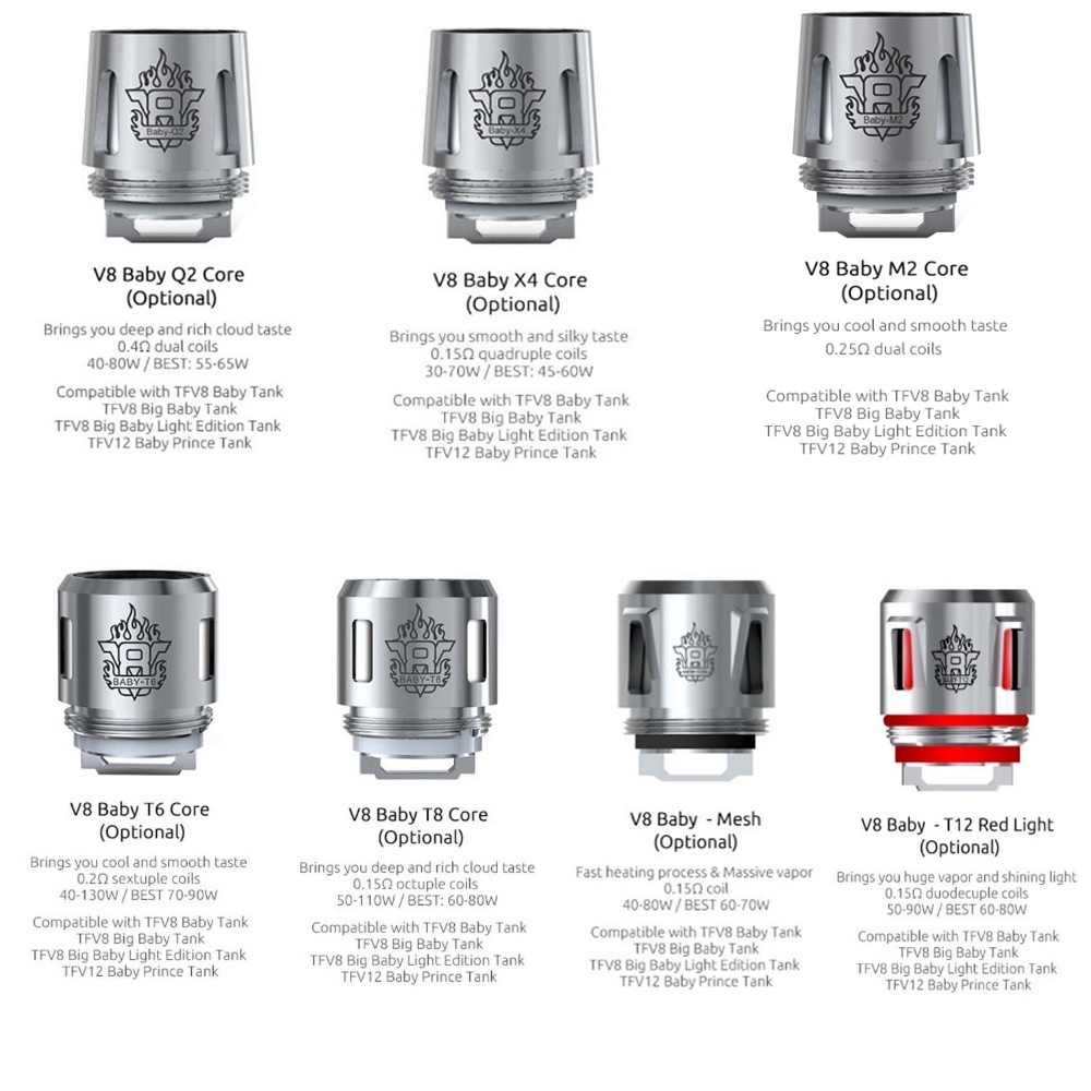 The V8 Baby-T8 is the compact rendition of the ultimate vapor production atomizer catering to cloud chasers with an optimal vaping range of 60 to 80W. The rebuildable RBA Atomizer comes as a single unit pack of one 1. 1 125 015ohm V8 Baby-T8 Octuple Coil Votes. 015Ω Octupole Coils 50-100WBest 60-80W Deep and Rich Cloud Taste. While the SMOK TFV8 Cloud Beast can compete with many RDAs in terms of vapor production the TFV8 Baby Beast isnt likely to win a cloud competition. V8 Baby Q2 Coil The Baby Q2 coil features a dual-coil setup runs a resistance rating of 04 ohms and features a power band between 40W to 80W with recommendations for best performance between 55W to 65W. TFV8 Baby Beast Replacement Coils are NOT compatible with the TFV8 Cloud Beast Sub-Ohm Tank.
